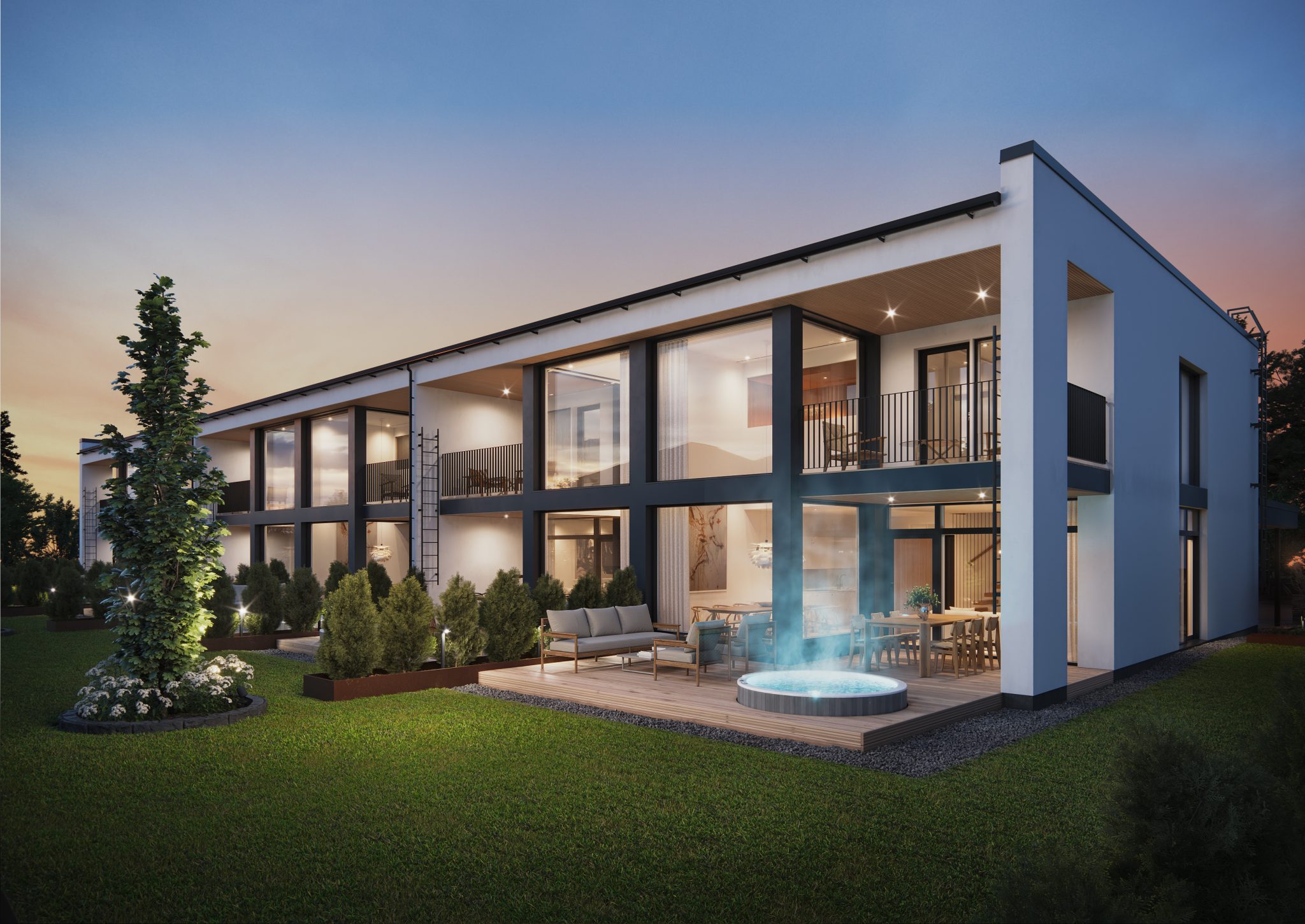 - Lisäneliöitä asumiseen tuo valaistu ja katettu terassi, parveke sekä juhlava sisääntulo. Poikkeuksellisen suurilta takaterasseilta löytyy varaus ulkoporealtaalle, jolloin mukavat olosuhteet terassillakin ovat taatut aina pitkälle syksyyn asti.