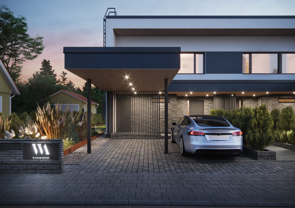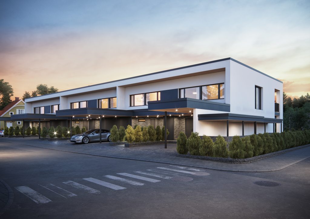 - Jokaisella asunnolla on yksi autokatospaikka sekä yksi pihapaikka sisäänkäynnin yhteydessä. Autokatoksessa on varaus sähköauton lataukselle ja pihapaikka on varusteltu sähköpistokkeella. Laatoitetun sisäänkäynnin yhteydestä löytyy asuntokohtainen lämmin varasto / tekninen tila. Tämän lisäksi säilytystilaa löytyy rivitalon päätyyn sijoittuvasta kellarikerroksesta, jossa jokaiselle asunnolle on varattu oma irtainvarasto.
