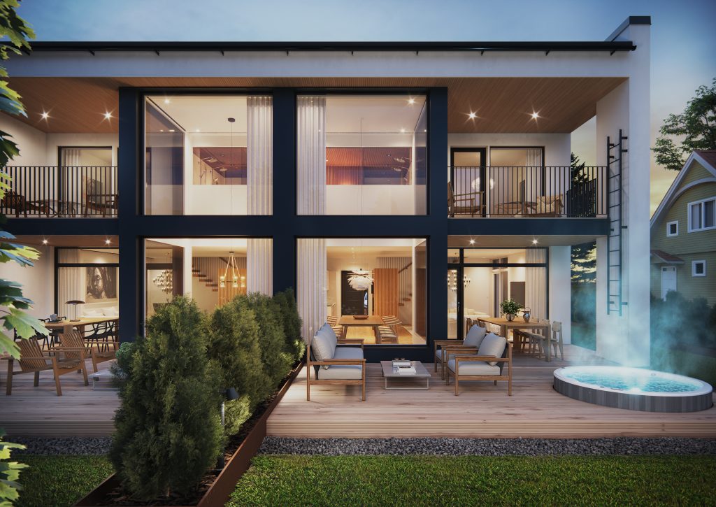 - Lisäneliöitä asumiseen tuo valaistu ja katettu terassi, parveke sekä juhlava sisääntulo. Poikkeuksellisen suurilta takaterasseilta löytyy varaus ulkoporealtaalle, jolloin mukavat olosuhteet terassillakin ovat taatut aina pitkälle syksyyn asti.