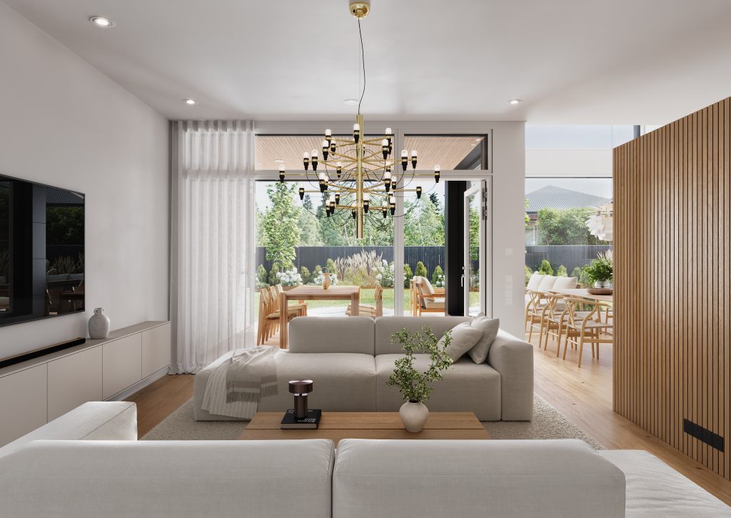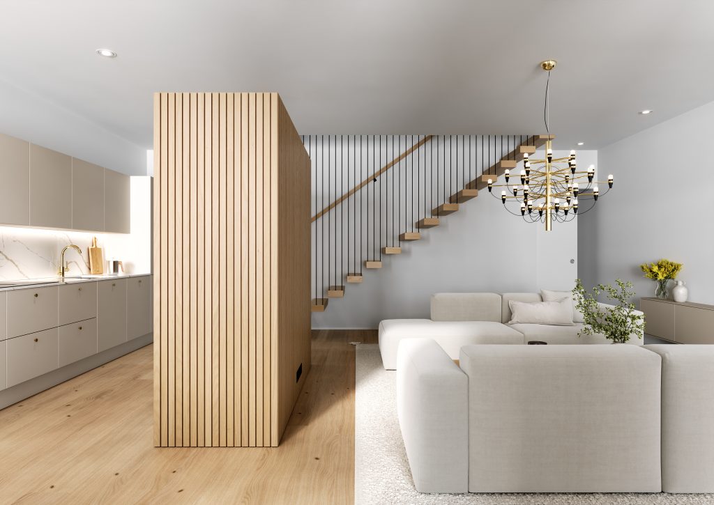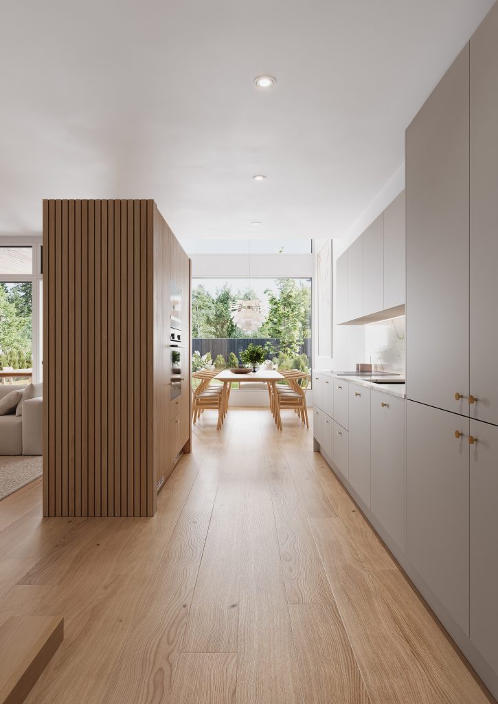 Avarat tilat ja luonnonvalo eivät ole tässä kodissa pelkästään luksusta erityisiin hetkiin, vaan osa jokapäiväistä arkea. Alakerran sydän on keittiö-ruokailutila-olohuoneen näyttävä kokonaisuus, joka kutsuu ympärilleen. Upea näkymä näihin tiloihin avautuukin jo heti ulko-ovelta. Katse kantaa eteisestä suoraan takapihan suurille ikkunoille saakka ja näkymän keskellä kohoaa korkea ruokailutila, jonka huonekorkeus yltää noin viiteen metriin. Rimapaneelilla verhoiltu tilanjakaja keittiön ja olohuoneen välillä kätkee sisäänsä korkeat kaapistot, jotka sulautuvat osaksi sisustusta. Kaapistojen ja rimapaneelien sävyt – kirkas, valkolakattu tai savutammi – ovat valittavissa asukkaan oman tyylin mukaan. Aamiaiskaappi, leveä tasotuuletin, kvartsikivi työtasoissa ja välitilassa sekä integroidut kodinkoneet viimeistelevät keittiön, jossa kauneus ja käytännöllisyys ovat saumattomassa tasapainossa.