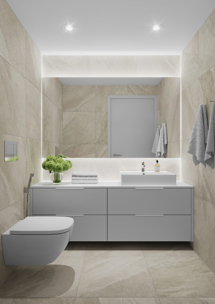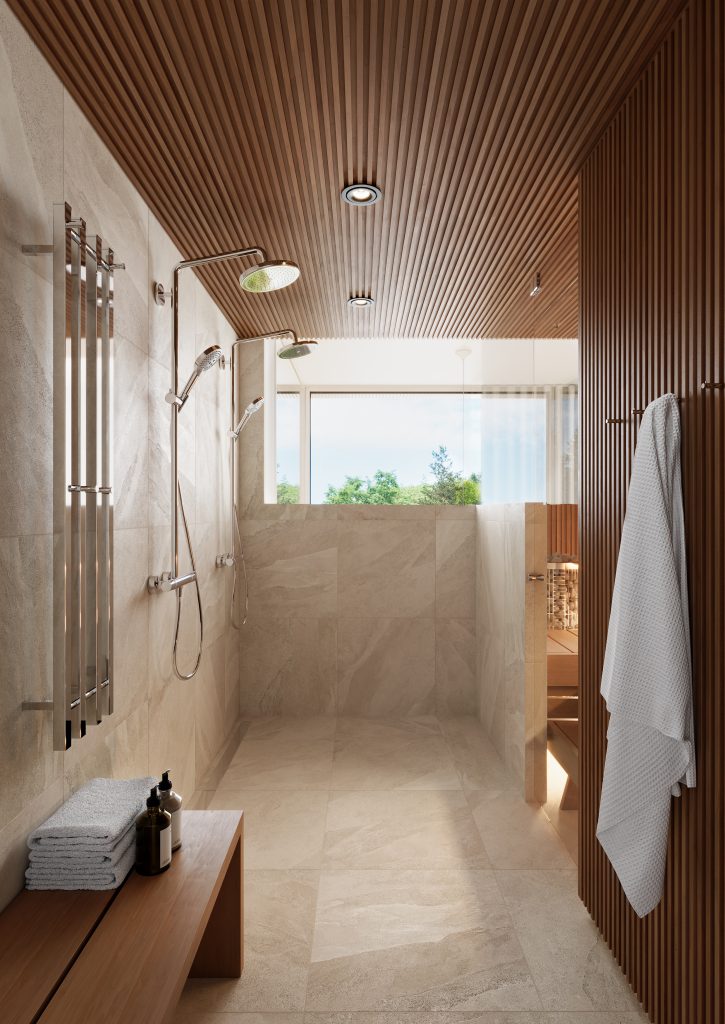 Kylpyhuone ja sauna muodostavat spa-henkisen kokonaisuuden. Kauniit suuret laatat, lasiseinä saunan ja kylpyhuoneen välillä, kaksi sadesuihkua sekä panoraamamainen nauhaikkuna tekevät kokonaisuudesta sekä ylellisen että rauhoittavan. Rimapaneelit jatkuvat seiniltä kattoon, luoden yhtenäisen ja harmonisen tunnelman. Kylpyhuoneesta löytyy lisäksi vakiovarusteena sähkökäyttöinen pyyhekuivan. Arjen sujuvuuden varmistamiseksi toisen kerroksen erillinen wc sijoittuu kylpyhuoneen ja saunan viereen ja sinne on käynti aulatilasta.