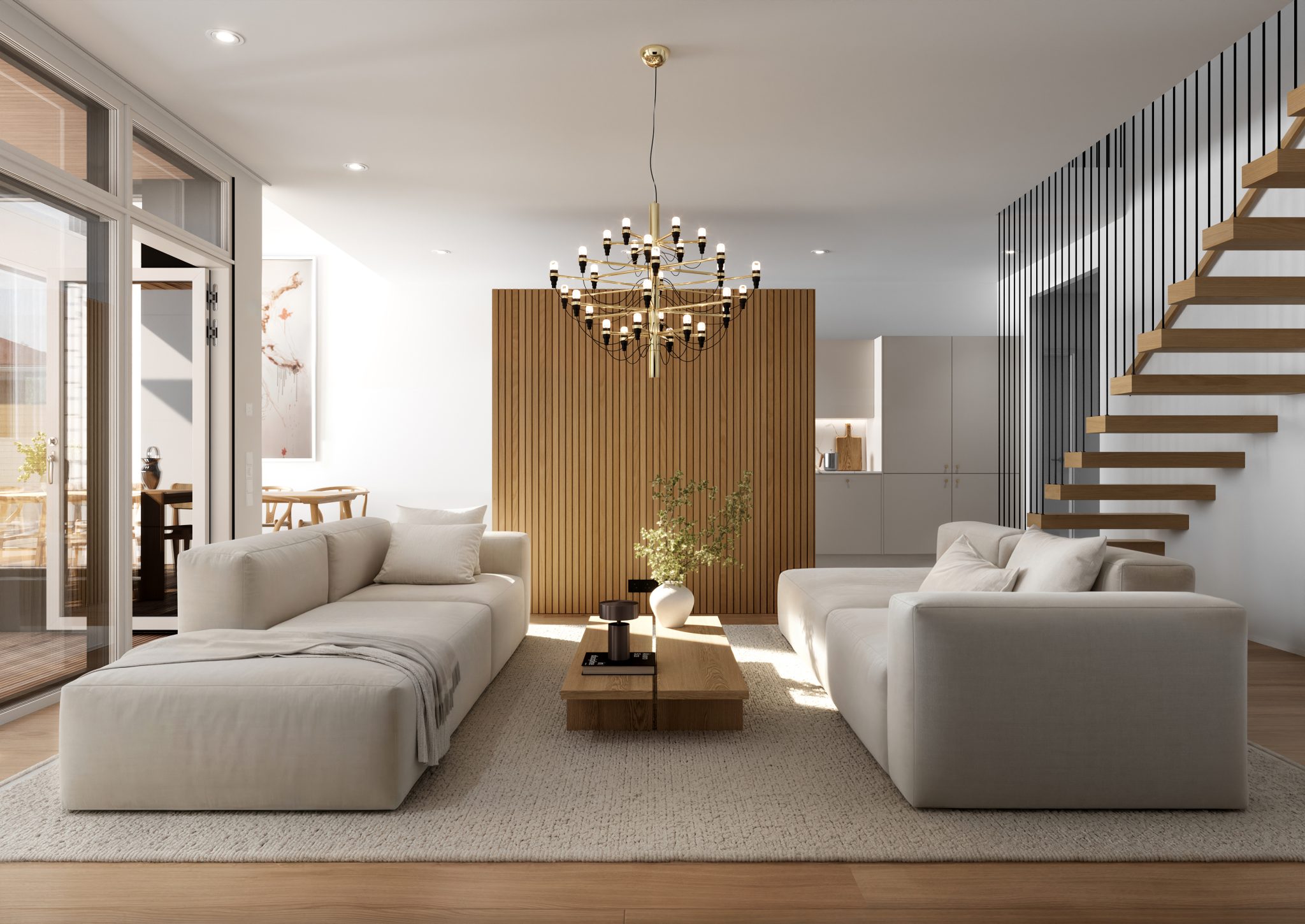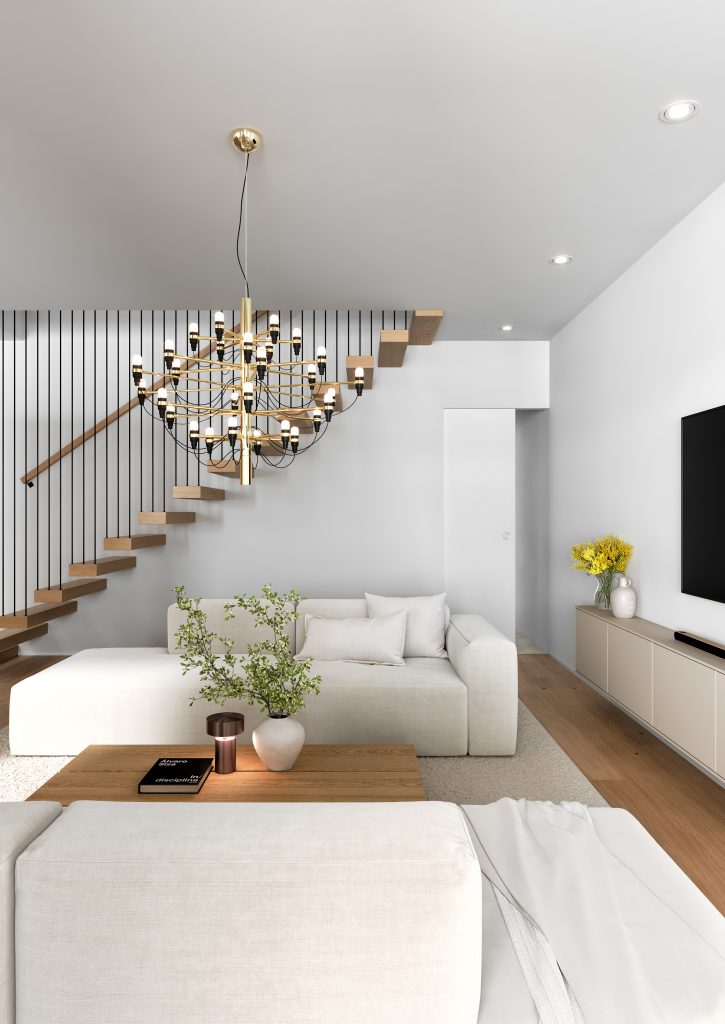 Olohuone tarjoaa sekä tilaa että tunnelmaa. Suuret ikkunat ja käynti takaterassille tekevät tilasta valoisan ja kutsuvan. Kalusteiden sijoittelulle on runsaasti vaihtoehtoja, ja tilaa riittää niin rennoille illoille kuin virallisemmillekin kohtaamisille. Olohuoneen kruunaa veistokselliset leijuvat portaat, jotka luovat kodin selkärangan. Mustat pinnakaiteet kohoavat aina yläkerran aulan kattoon asti, luoden arkkitehtonista mielenkiintoa ja jatkumoa molempiin kerroksiin.